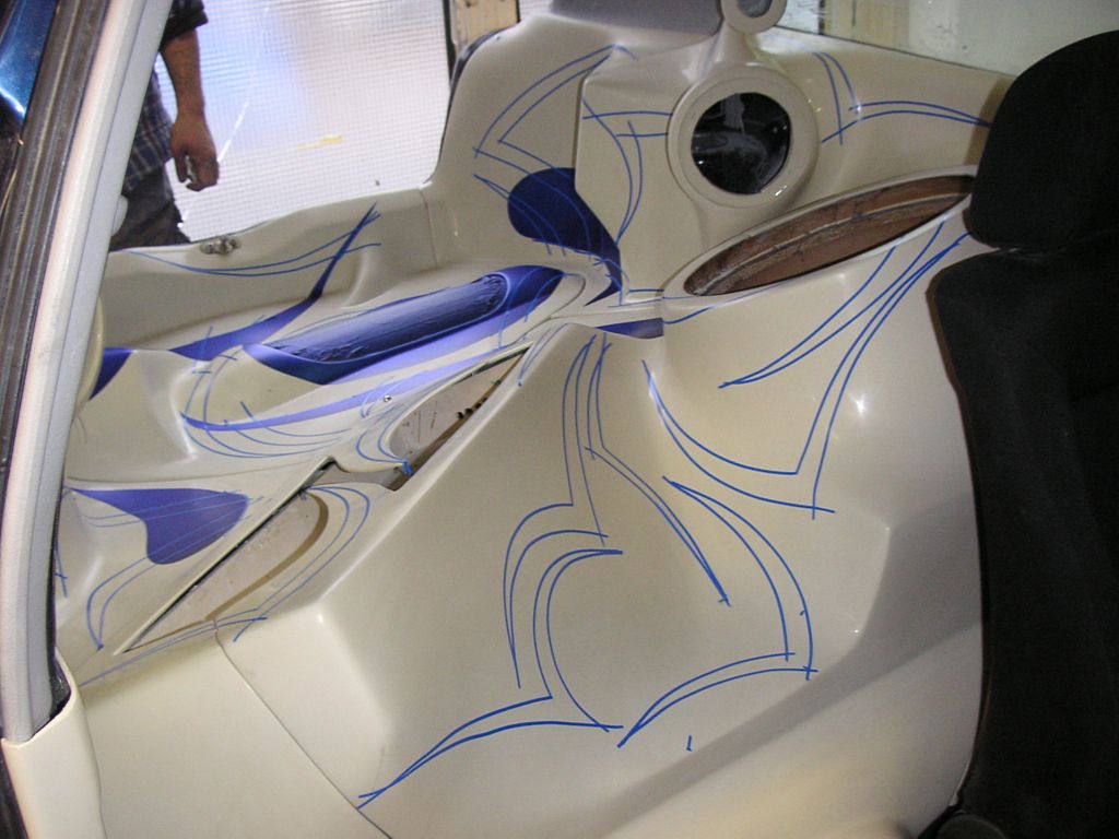 Im Winter haben wir ein Konzept für die Innenausstattung mit Stephan erarbeitet. Dabei wurden die Farben und die Hifi - Komponenten wurden vorgegeben. In einer Umbauzeit von ca. 6 Wochen wurde dann der Himmel aus GFK gefertigt und Totenköpfe eingearbeitet. Der komplette Heckausbau wurde bist zu den Vordersitzen gestaltet. Hier ist besonders die Form des Ausbaus ein Blickfang. Nach der Erstellung wurde der Ausbau in vier große Stücke geteilt um leicht an Airride und Hifi - Komponenten zu gelangen. B und C Säulen wurden danach an den Ausbau angepasst. Der untere Teil der Türverkleidung wurde komplett aus GFK gefertigt und eingearbeitet. Muster und Farbe von Leder haben wir ausgesucht und Satteln lassen. Airbrush entstand von DelNilo, sowie die restliche Lackierung des ganzen Autos.