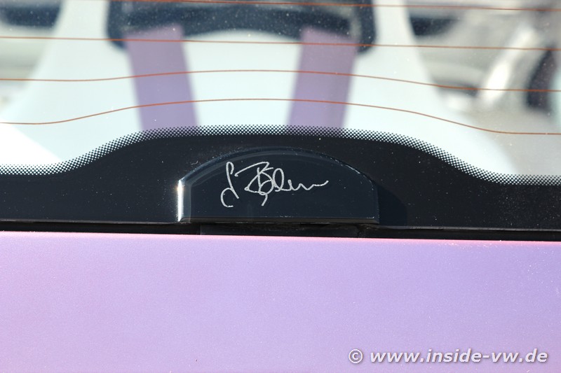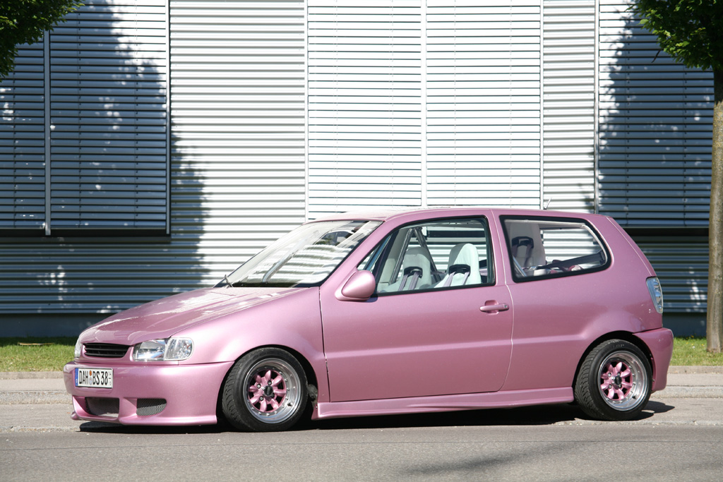 Interiuer: 30er Momo Lenkrad, Zeiger in der Instrumententafel auf "12 Uhr" Stellung, weiße Tachoscheiben, Schwarzlichinstrumentenbeleuchtung, Handbremshebel und Schaltknauf von Momo, R32 Pedalauflagen, drei Königsschalensitze, rosane Schrothgurte (Sonderanfertigung), polierter Wiechers Alu-Käfig, Einstiegsleisten mit Polo Schriftzug